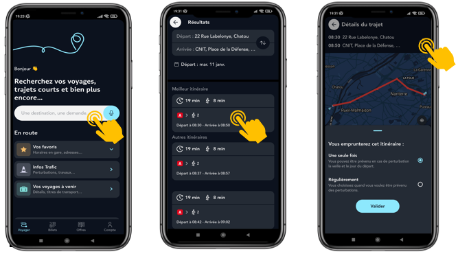 1. Lancez une recherche itinéraire depuis la folio d'accueil, choisissez une proposition d'itinéraire et cliquez sur l'étoile pour mettre cet itinéraire en favoris et commencer le paramétrage.